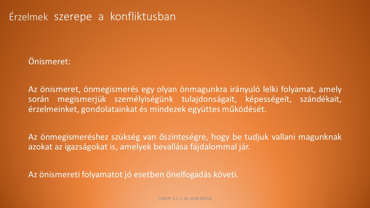 A, Egy olyan lelki folyamat, amely során megismerjük személyiségünk tulajdonságait, képességeit, szándékait, érzelmeinket, gondolatainkat és mindezek együttes működését.