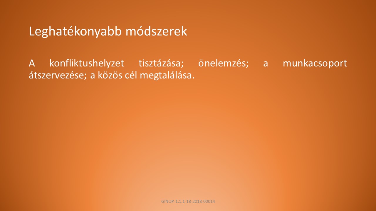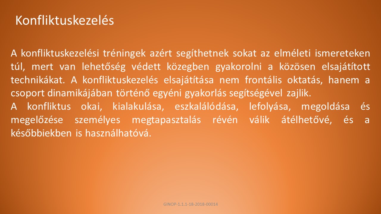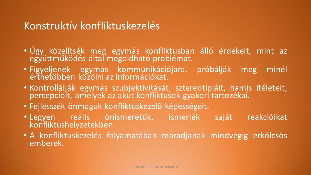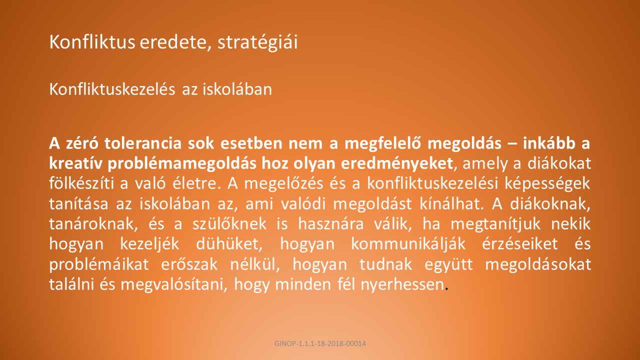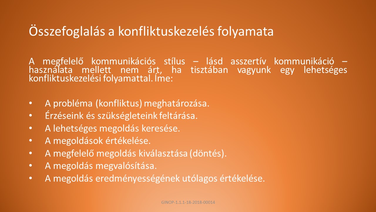 A, A felek tudják meghatározni, hogy milyen típusú konfliktusban vesznek részt. Legyenek tudatában az erőszak okainak és következményeinek, ismerjenek alternatívákat az erőszakra. Ne kerüljék el, hanem vállalják a konfliktust.