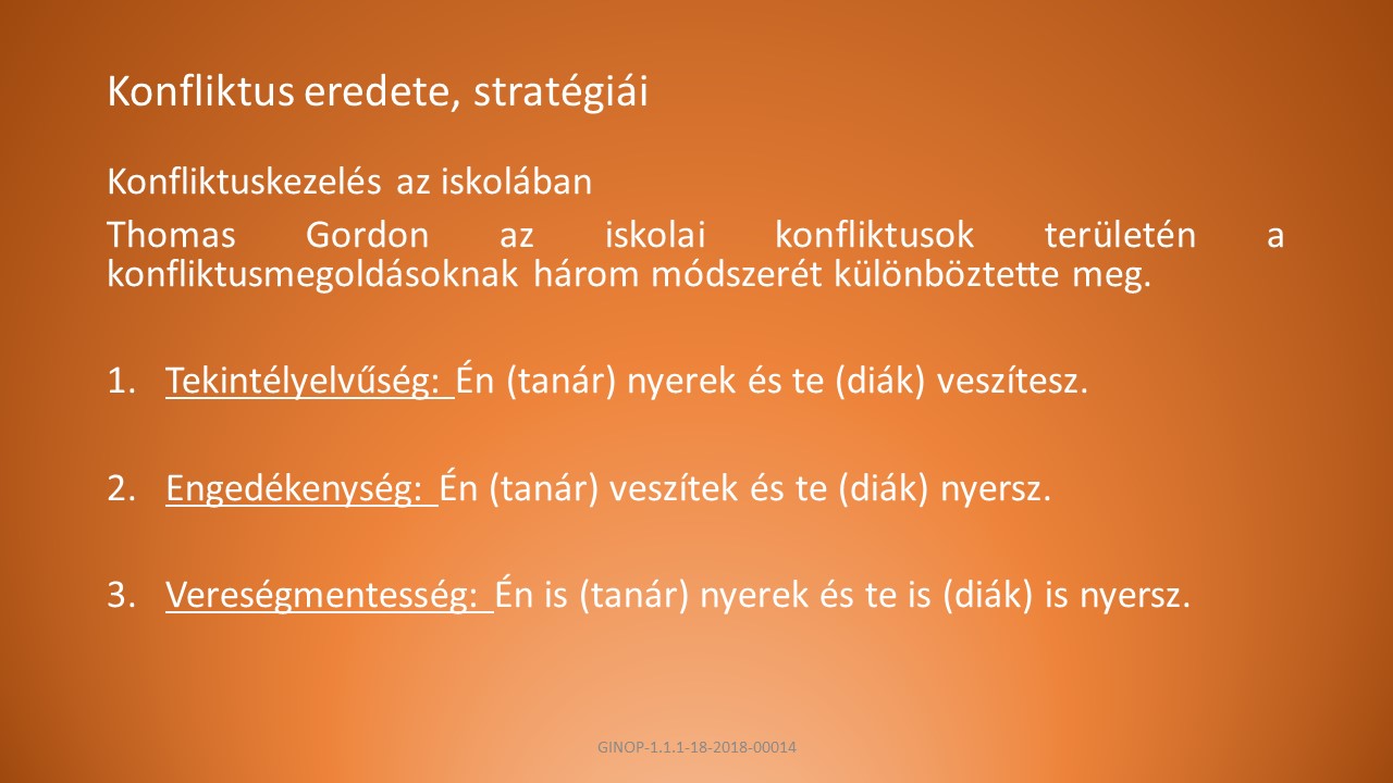 Thomas Gordon az iskolai konfliktusok területén a konfliktusmegoldásoknak három módszerét különböztette meg, melyik ez a három?
