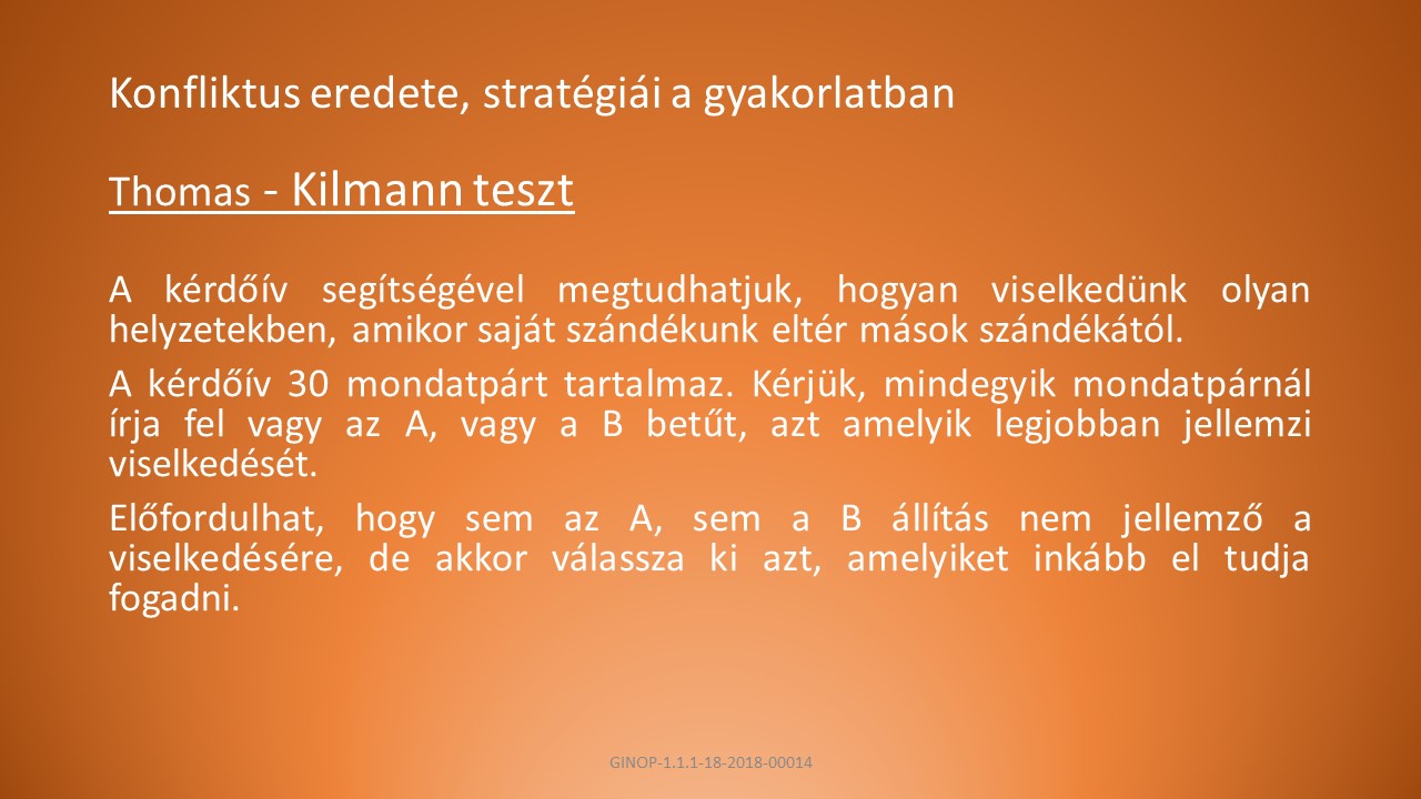 A, Az egyéni viselkedés vizsgálata konfliktushelyzetekben. Konfliktushelyzetek azok a szituációk, melyekben két ember törekvései összeegyeztethetetlennek tűnnek.