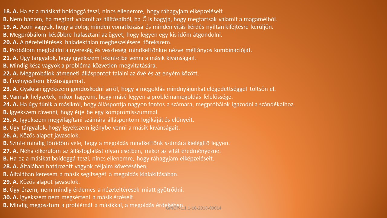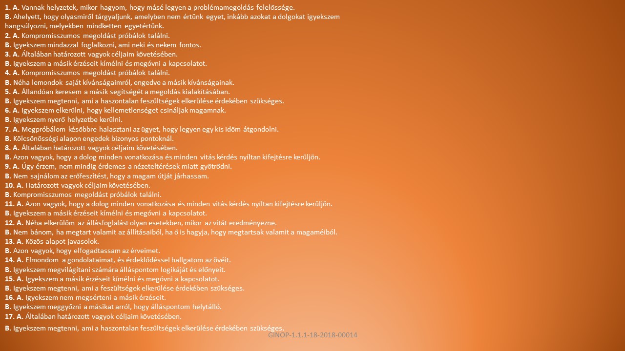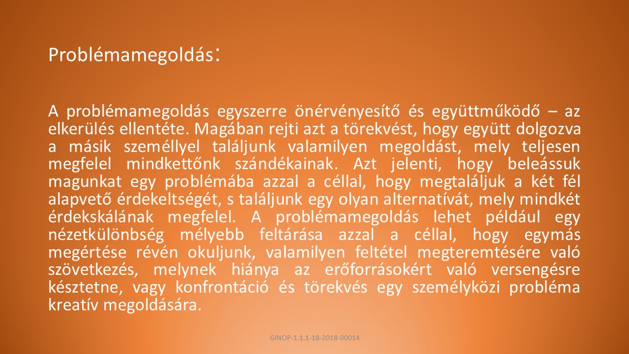 B, Azt jelenti, hogy beleássuk magunkat egy problémába azzal a céllal, hogy megtaláljuk a két fél alapvető érdekeltségét, s találjunk egy olyan alternatívát, mely mindkét érdekskálának megfelel.