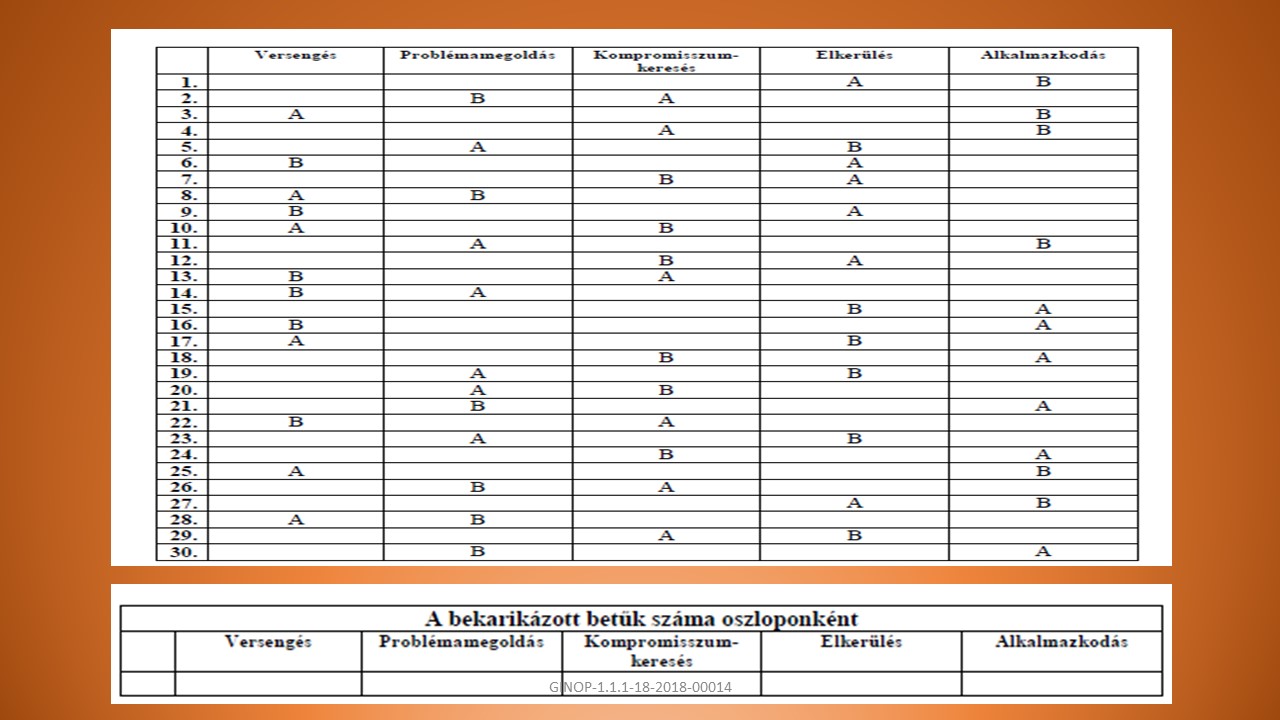 A, elkerülő, versengő, alkalmazkodó, kompromisszumkereső, problémamegoldó