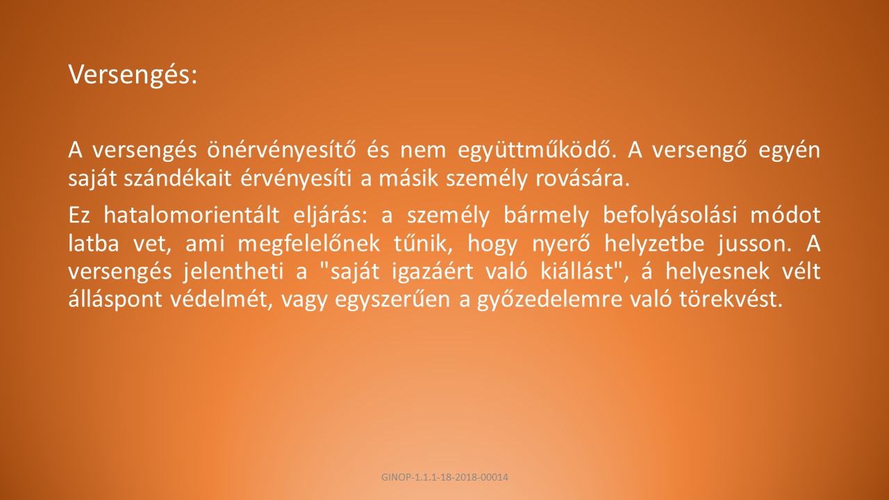 B, A versengés önérvényesítő és nem együttműködő. A versengő egyén saját szándékait érvényesíti a másik személy rovására.