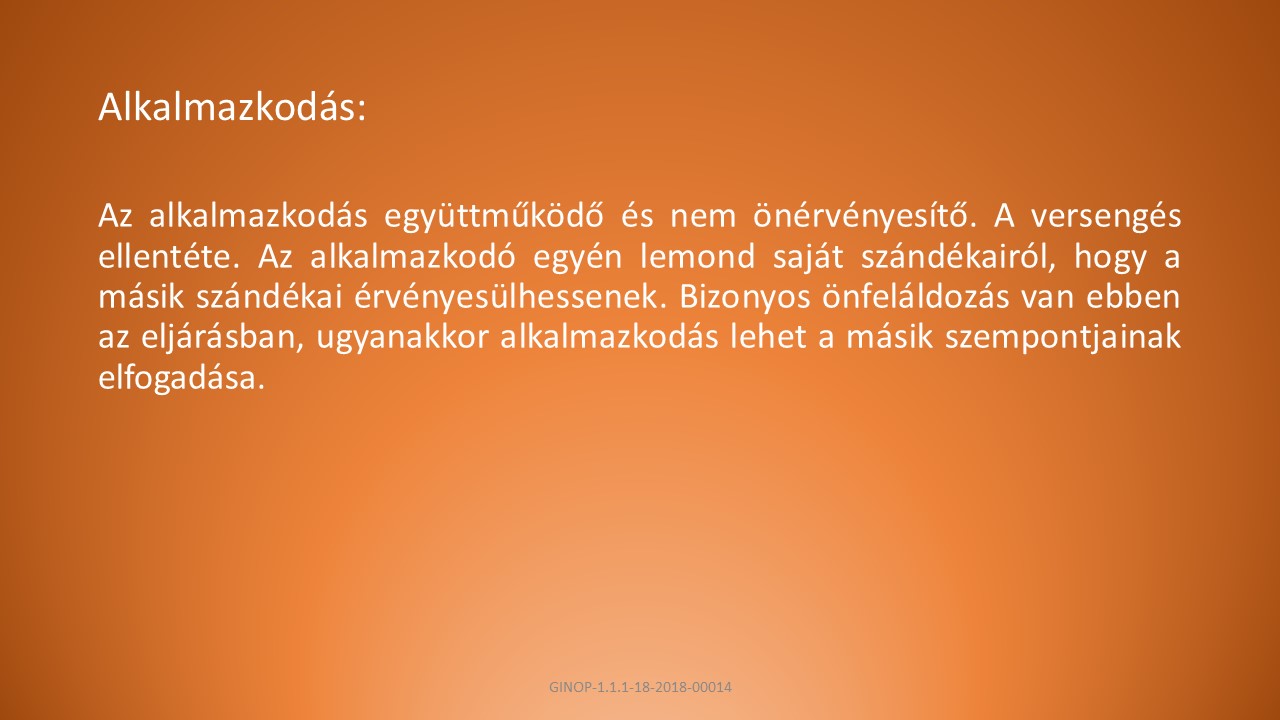 A, Az alkalmazkodás együttműködő és nem önérvényesítő. A versengés ellentéte. Az alkalmazkodó egyén lemond saját szándékairól, hogy a másik szándékai érvényesülhessenek. Bizonyos önfeláldozás van ebben az eljárásban, ugyanakkor alkalmazkodás lehet a másik szempontjainak elfogadása.