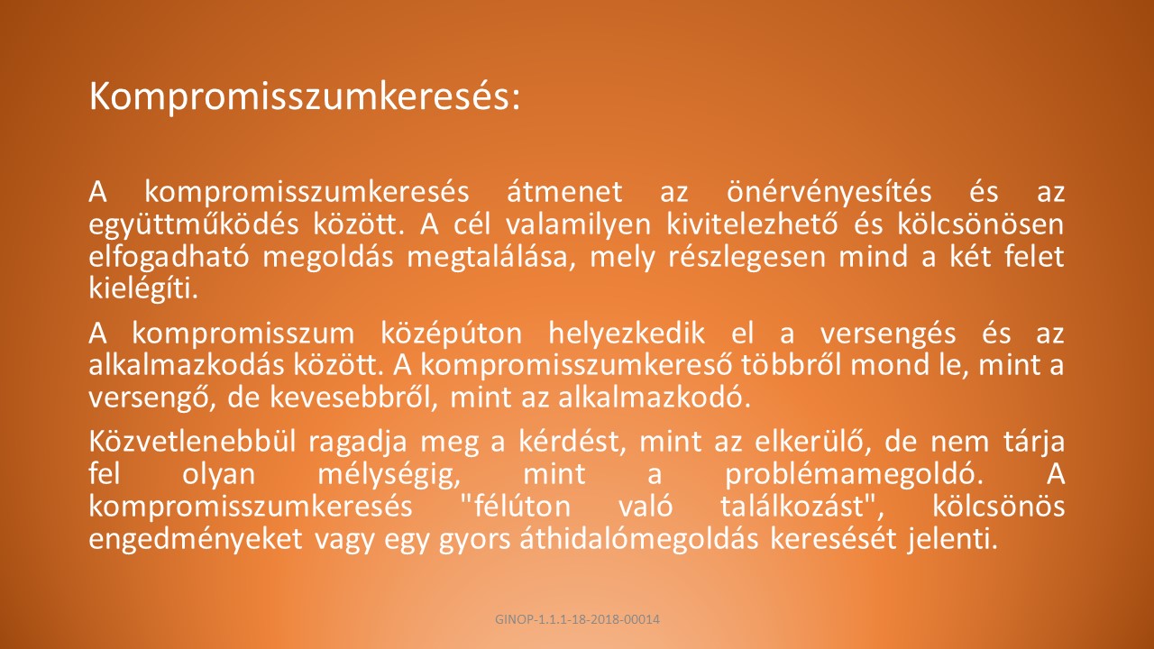 A, A kompromisszumkeresés átmenet az önérvényesítés és az együttműködés között. A cél valamilyen kivitelezhető és kölcsönösen elfogadható megoldás megtalálása, mely részlegesen mind a két felet kielégíti.