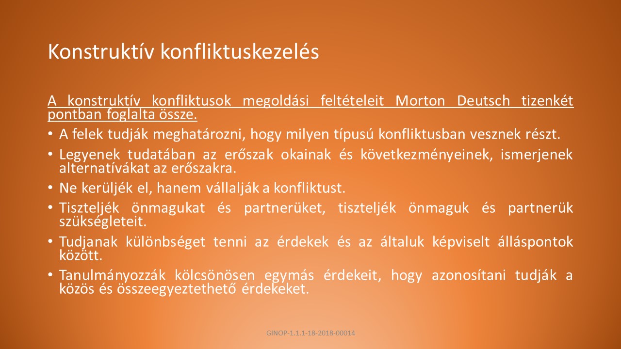 A konstruktív konfliktusok megoldási feltételeit Morton Deutsch tizenkét pontban foglalta össze soroljon fel ezek közül néhányat!
