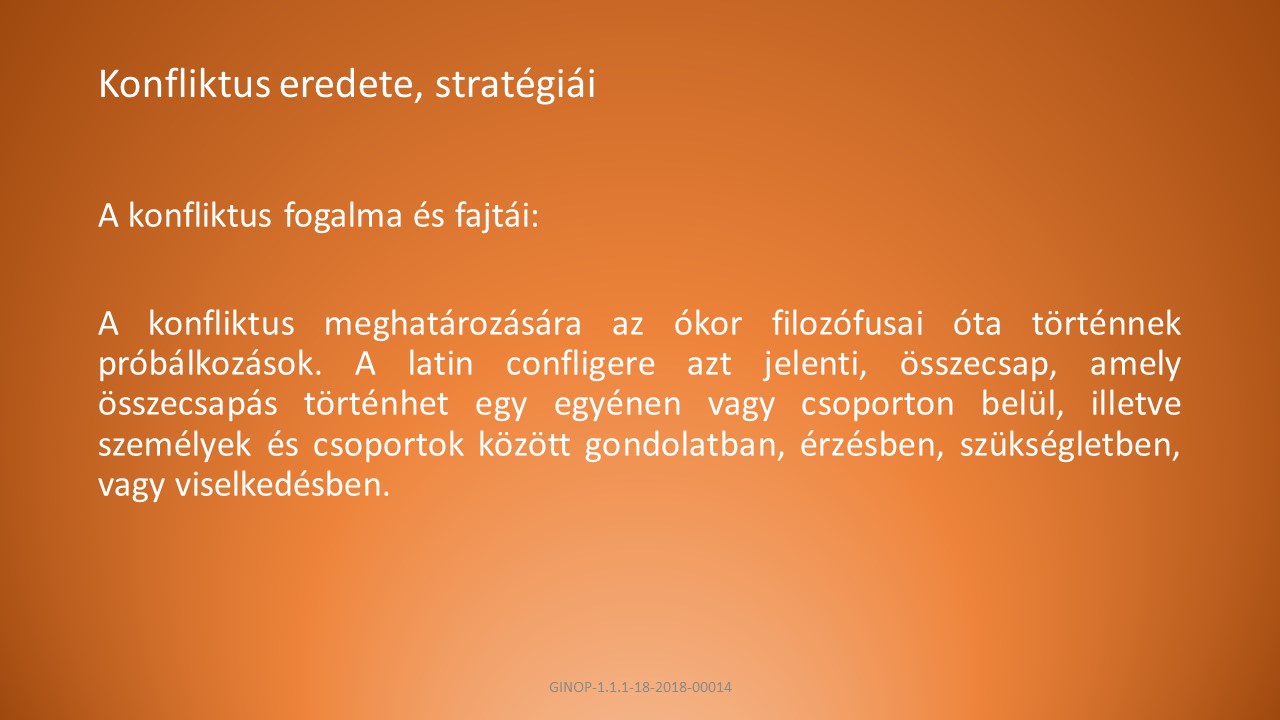 A, A konfliktus meghatározására az ókor filozófusai óta történnek próbálkozások. A latin confligere azt jelenti, összecsap, amely összecsapás történhet egy egyénen vagy csoporton belül, illetve személyek és csoportok között gondolatban, érzésben, szükségletben, vagy viselkedésben.