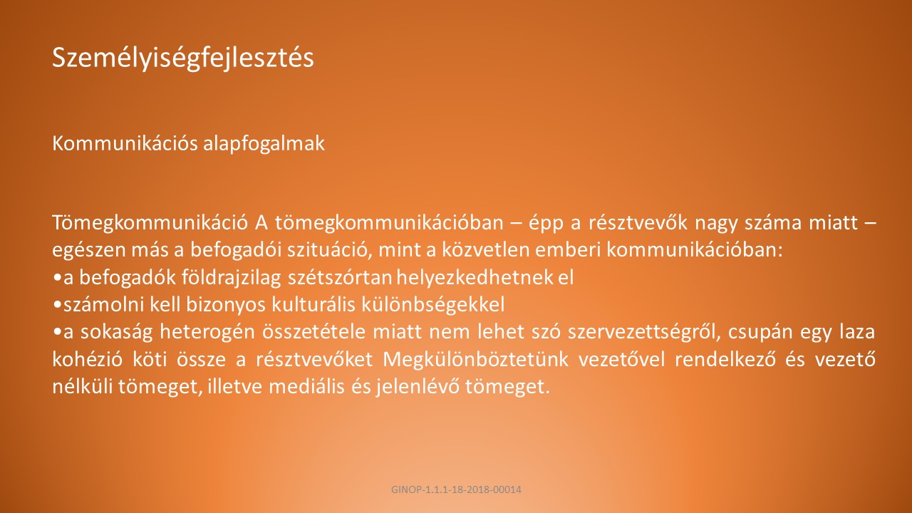 A, A résztvevők nagy száma miatt – egészen más a befogadói szituáció, mint a közvetlen emberi kommunikációban