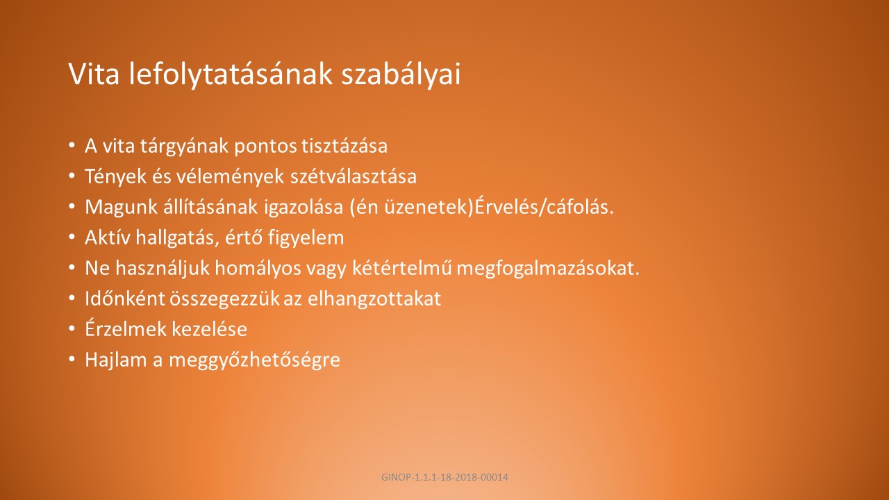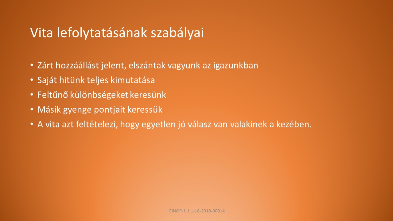 A, Eltérő álláspontok, nézetek ütköztetése kettő vagy több ember között.