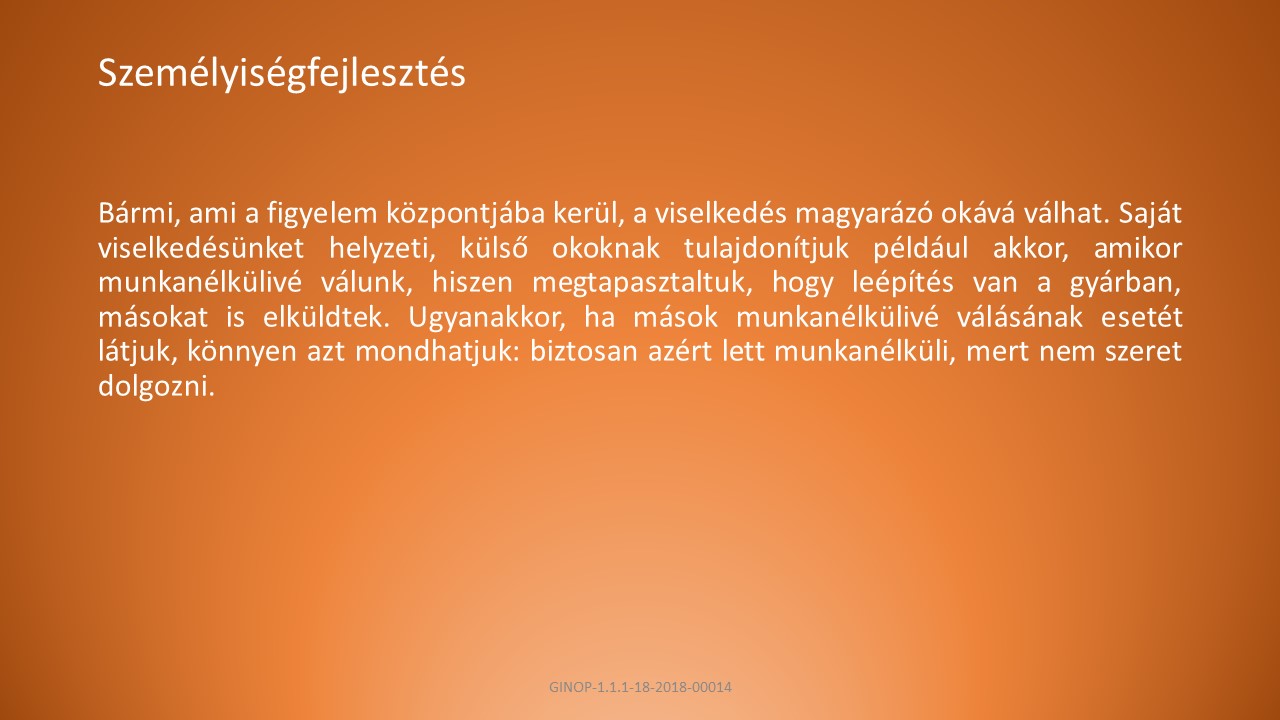 B, Saját viselkedésünket helyzeti, külső okoknak tulajdonítjuk például akkor, amikor munkanélkülivé válunk, hiszen megtapasztaltuk, hogy leépítés van a gyárban, másokat is elküldtek.