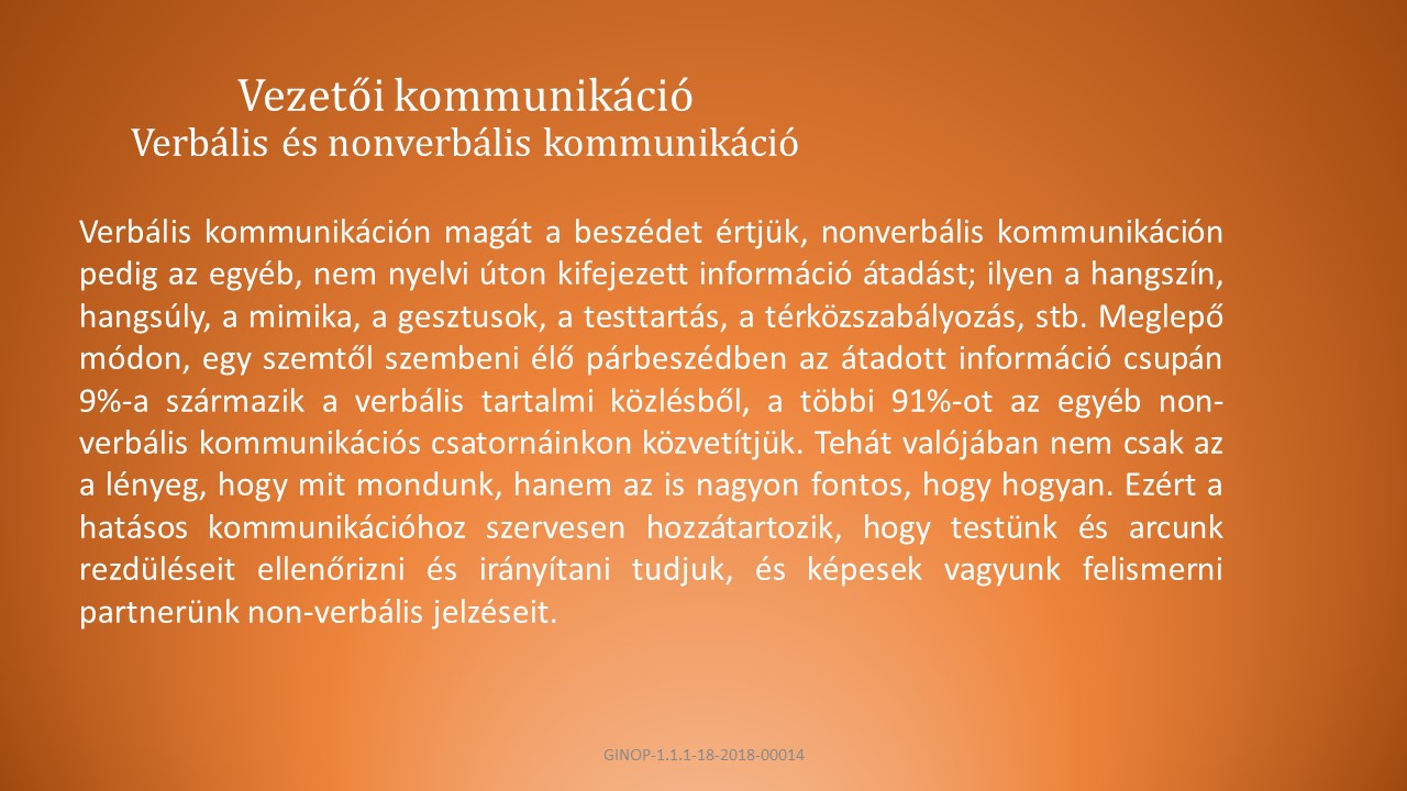 A, Magát a beszédet értjük, nonverbális kommunikáción pedig az egyéb, nem nyelvi úton kifejezett információ átadást; ilyen a hangszín, hangsúly, a mimika, a gesztusok, a testtartás, a térközszabályozás, stb.