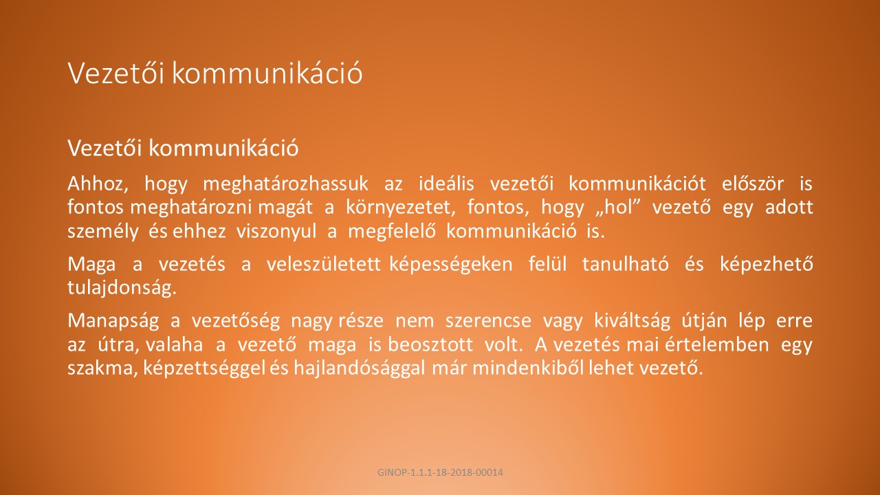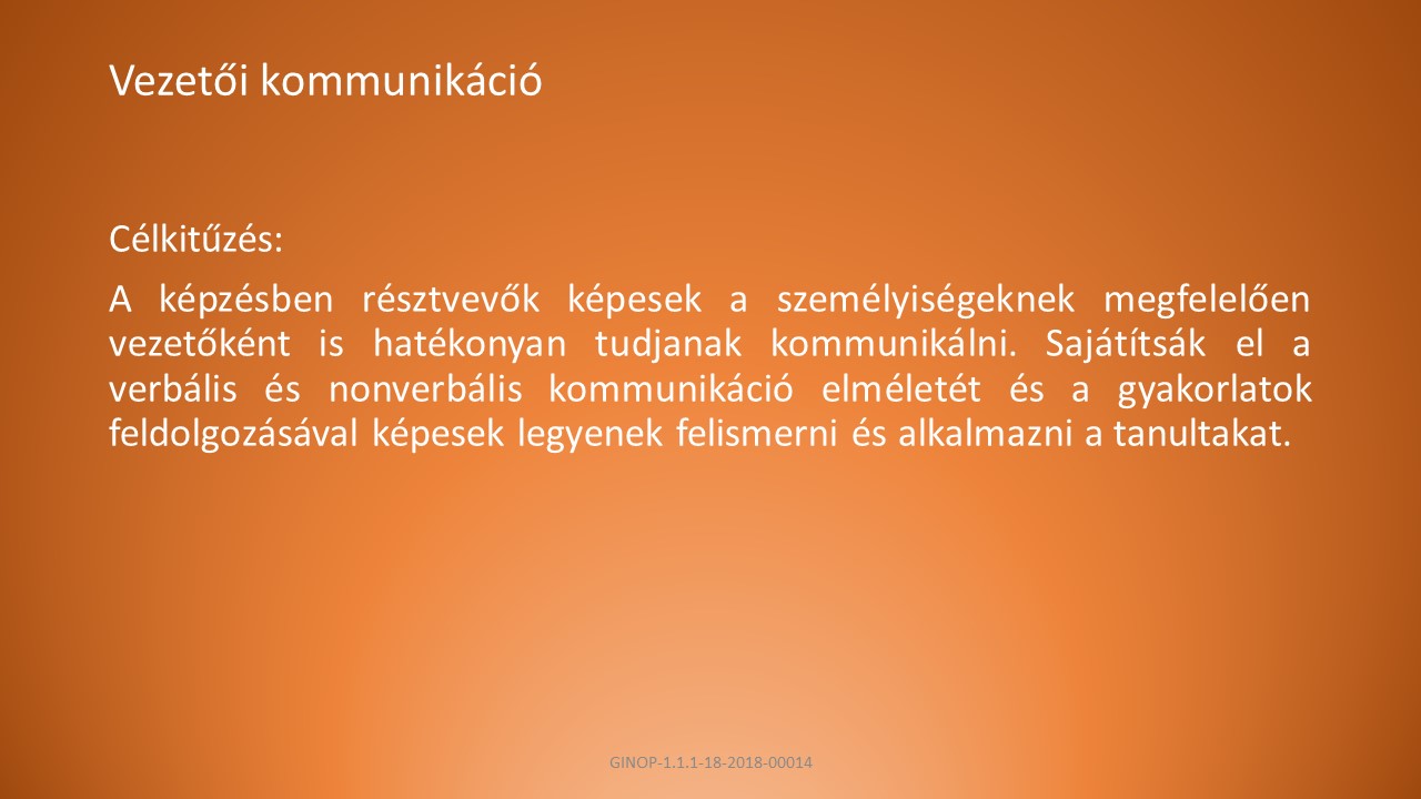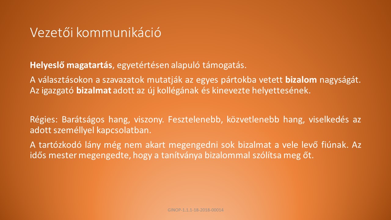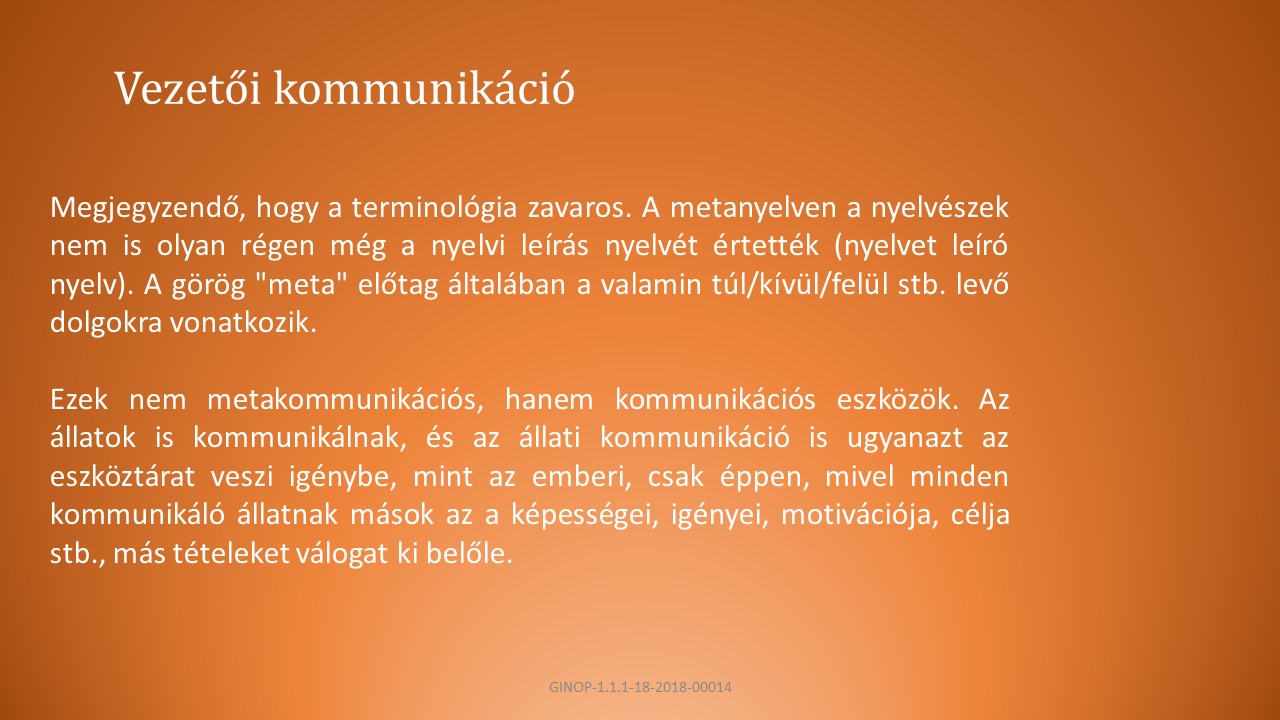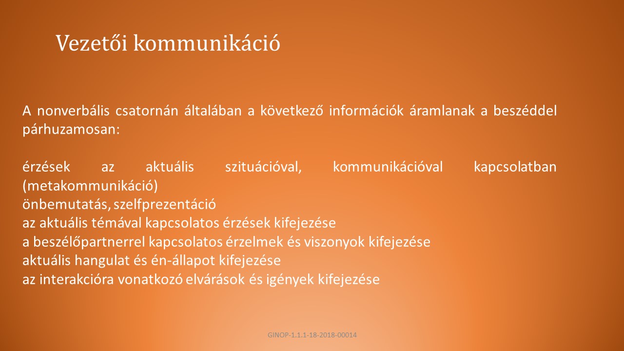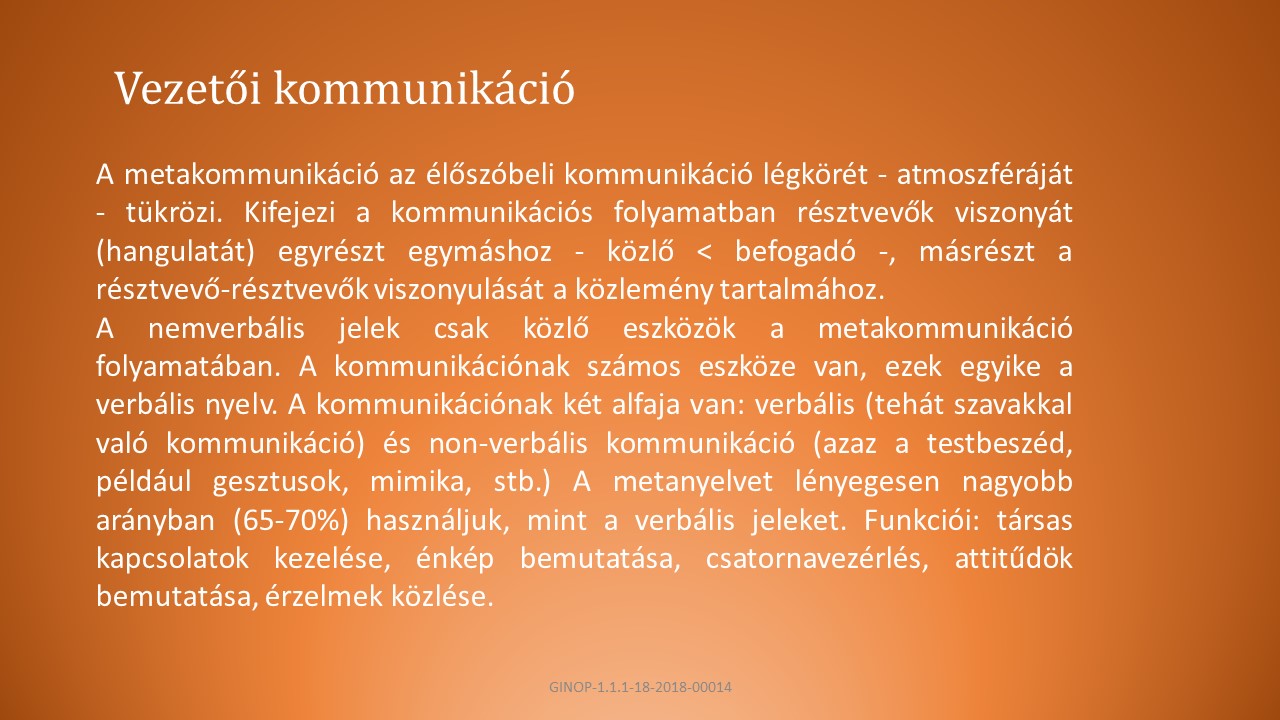 B, Kifejezi a kommunikációs folyamatban résztvevők viszonyát (hangulatát) egyrészt egymáshoz - közlő < befogadó -, másrészt a résztvevő-résztvevők viszonyulását a közlemény tartalmához. A nemverbális jelek csak közlő eszközök a metakommunikáció folyamatában.
