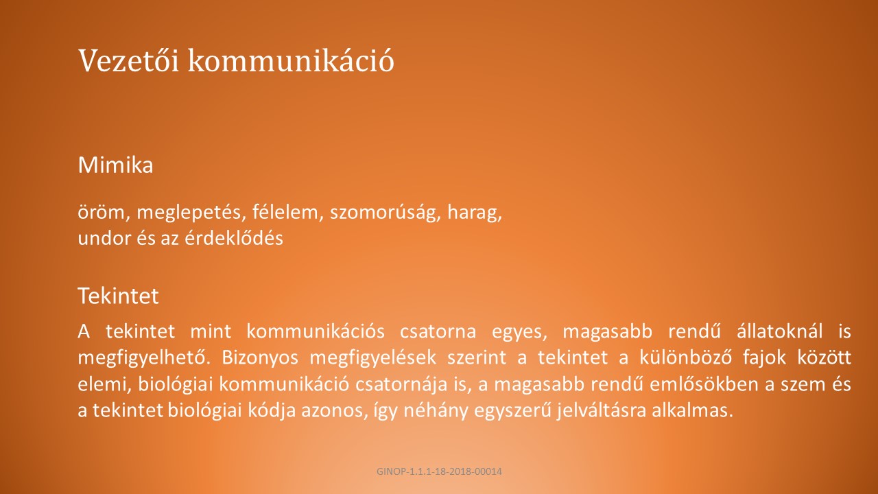 B, A kommunikációs folyamatban a nem verbális jelek használatát. Fajtái: mimika, vokális kommunikáció, tekintet, mozgásos kommunikáció, testtartás, térköz.