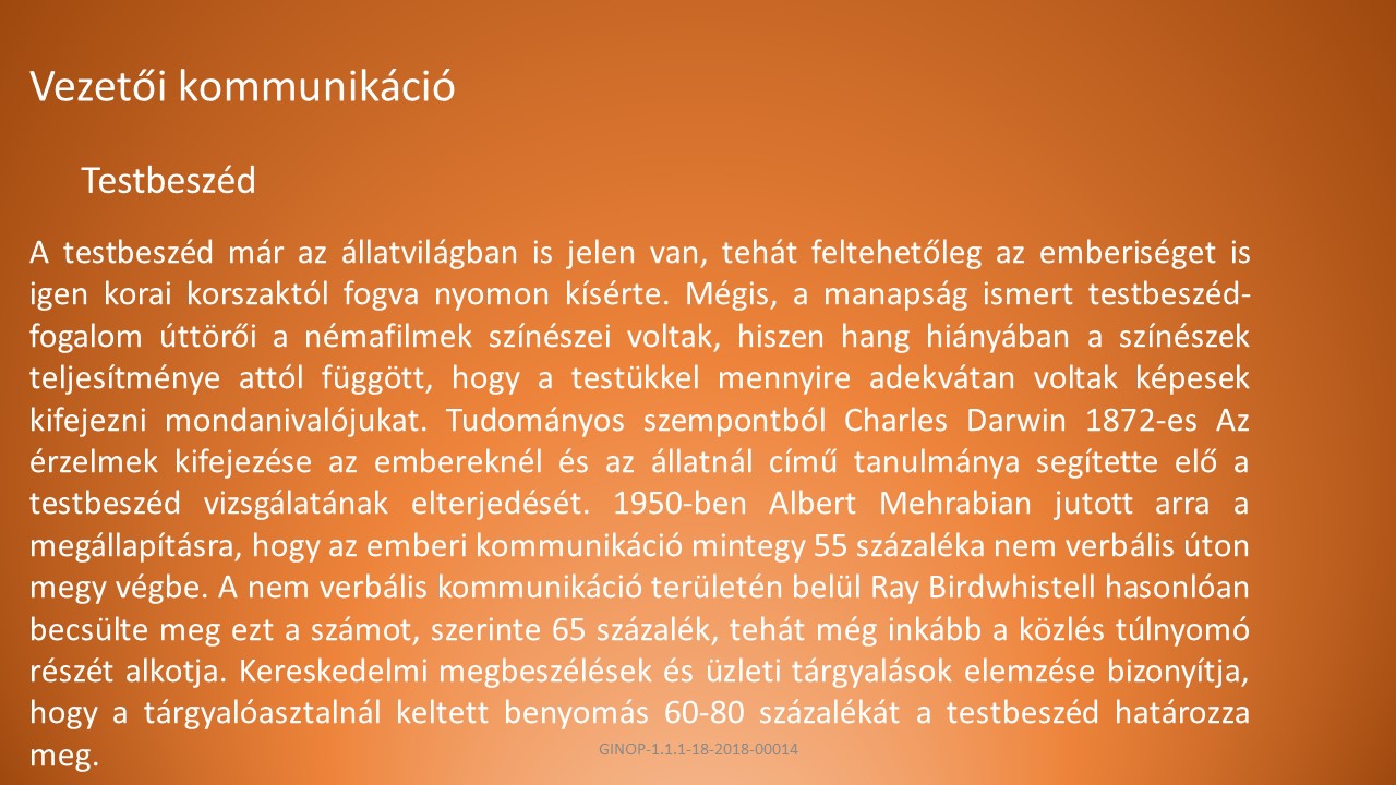 A, Az érzelmek kifejezése az embereknél és az állatnál című tanulmánya segítette elő a testbeszéd vizsgálatának elterjedését. 1950-ben Albert Mehrabian jutott arra a megállapításra, hogy az emberi kommunikáció mintegy 55 százaléka nem verbális úton megy végbe. A nem verbális kommunikáció területén belül Ray Birdwhistell hasonlóan becsülte meg ezt a számot, szerinte 65 százalék, tehát még inkább a közlés túlnyomó részét alkotja. Kereskedelmi megbeszélések és üzleti tárgyalások elemzése bizonyítja, hogy a tárgyalóasztalnál keltett benyomás 60-80 százalékát a testbeszéd határozza meg.
