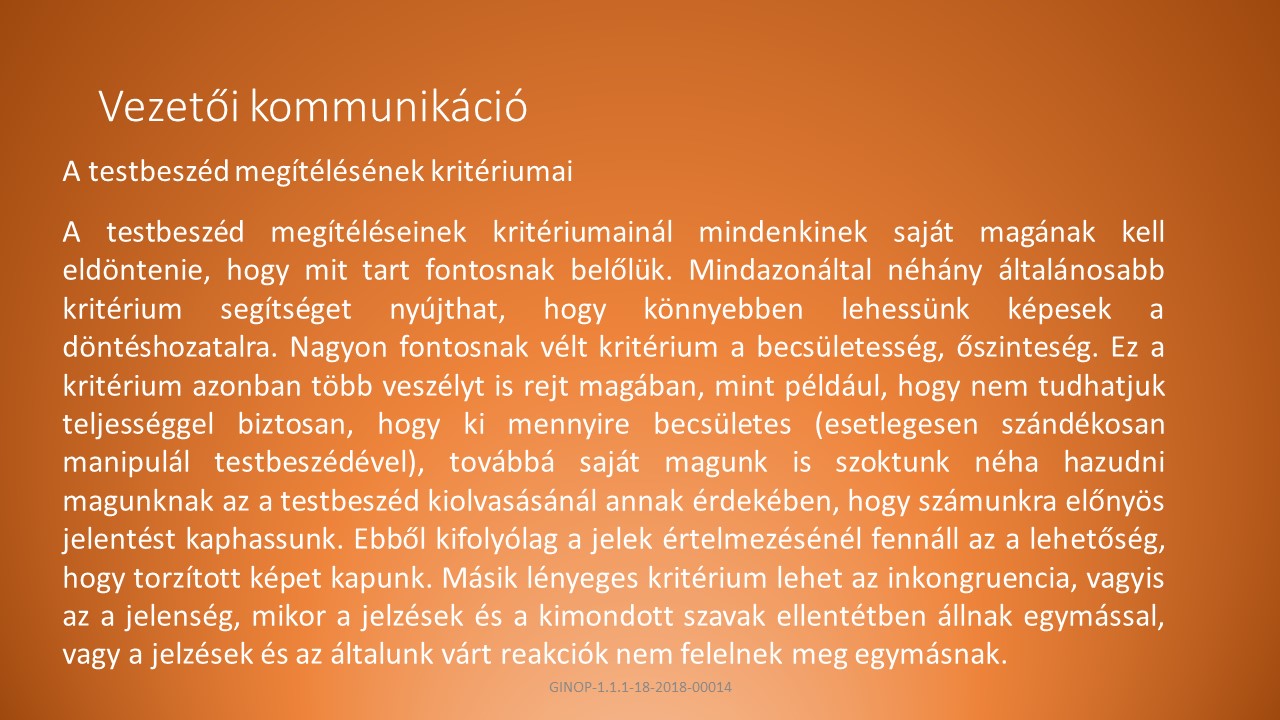 B, Figyelni kell a spontaneitásra is, mint lehetséges kritériumra, hiszen minél spontánabb valami, annál kevésbé van átgondolva. Újabb lehetséges kritérium, amire nem árt ügyelni, a tréfálkozás, hiszen nem mindig értünk egy jelzésen azt, amit valójában jelent , ám ha valaki mégis komolyan veszi, az könnyen félreértéshez vezethet. Végezetül pedig önmagában egyetlen jelzés nem jelent semmit, vagy legalábbis nem vehető teljesen biztosnak. A testbeszéd és a verbális beszéd kölcsönösen függnek egymástól.