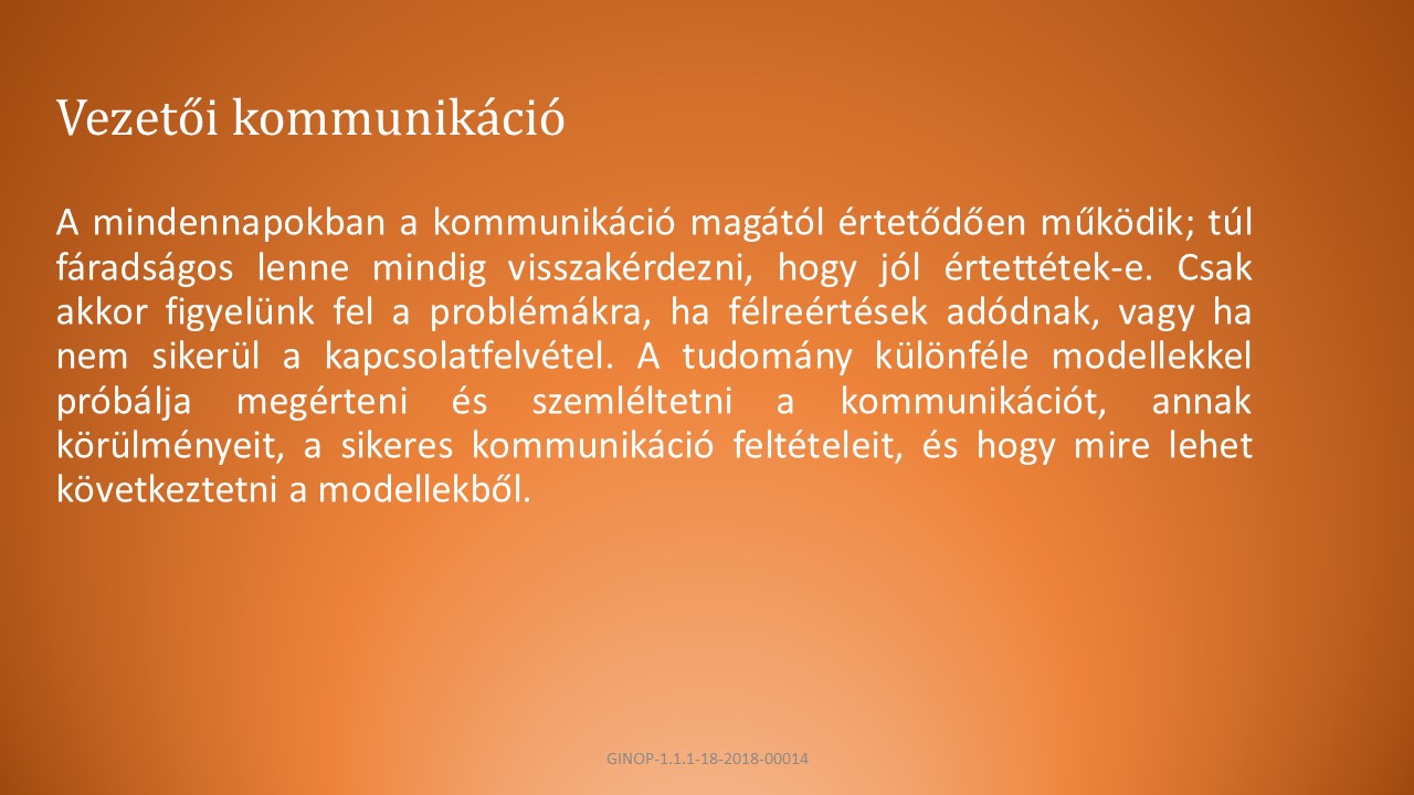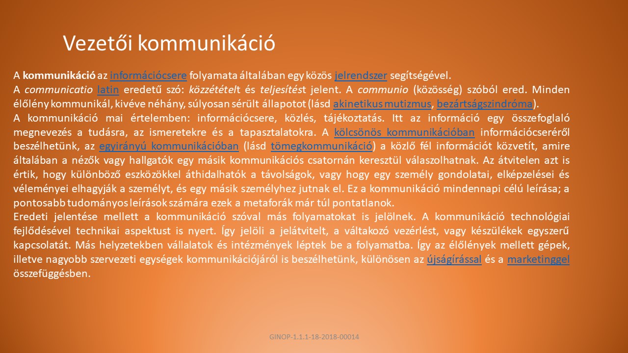 A, Az információcsere folyamata általában egy közös jelrendszer segítségével. A communicatio latin eredetű szó: közzétételt és teljesítést jelent. A communio (közösség) szóból ered. Minden élőlény kommunikál, kivéve néhány, súlyosan sérült állapotot (lásd akinetikus mutizmus, bezártságszindróma). A kommunikáció mai értelemben: információcsere, közlés, tájékoztatás. Itt az információ egy összefoglaló megnevezés a tudásra, az ismeretekre és a tapasztalatokra.