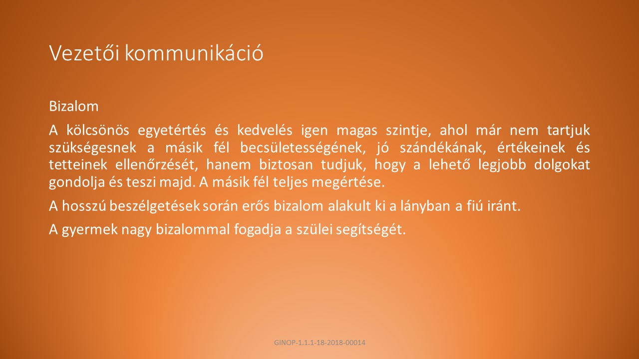 B, A kölcsönös egyetértés és kedvelés igen magas szintje, ahol már nem tartjuk szükségesnek a másik fél becsületességének, jó szándékának, értékeinek és tetteinek ellenőrzését, hanem biztosan tudjuk, hogy a lehető legjobb dolgokat gondolja és teszi majd. A másik fél teljes megértése.
